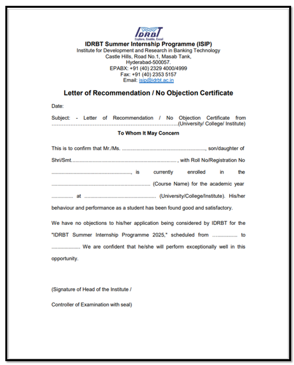 - Scanned copy of the filled, duly signed, and stamped Letter of Recommendation / No-Objection Certificate