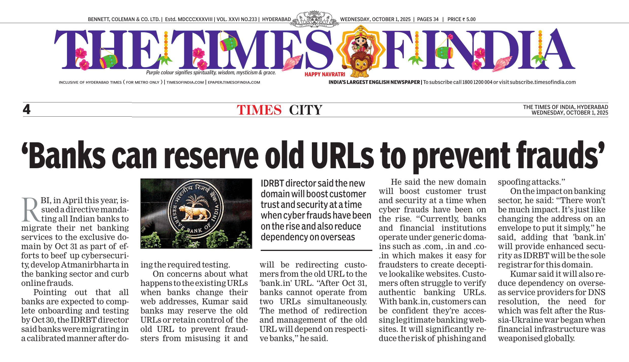 'Banks can reserve old URLs to prevent frauds' | Times of India | 01-10-2025 |